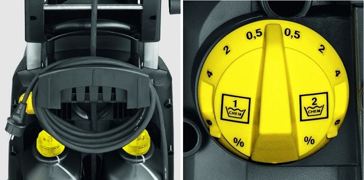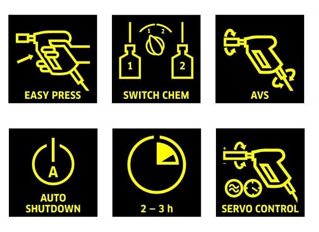 Dotata di motori elettrici raffreddati ad aria/acqua, di vano porta accessori e del nuovo sistema Switch CHEM, permette un dosaggio accurato del detergente.