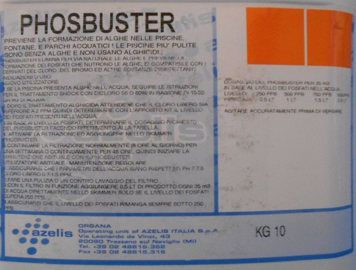 Modalità d’impiego: Con il filtro in funzione, agitare bene la confezione e aggiungere 0,5 lt di prodotto ogni 35 m3 di acqua (direttamente nello skimmer se il livello dei fosfati supera 250 ppb).